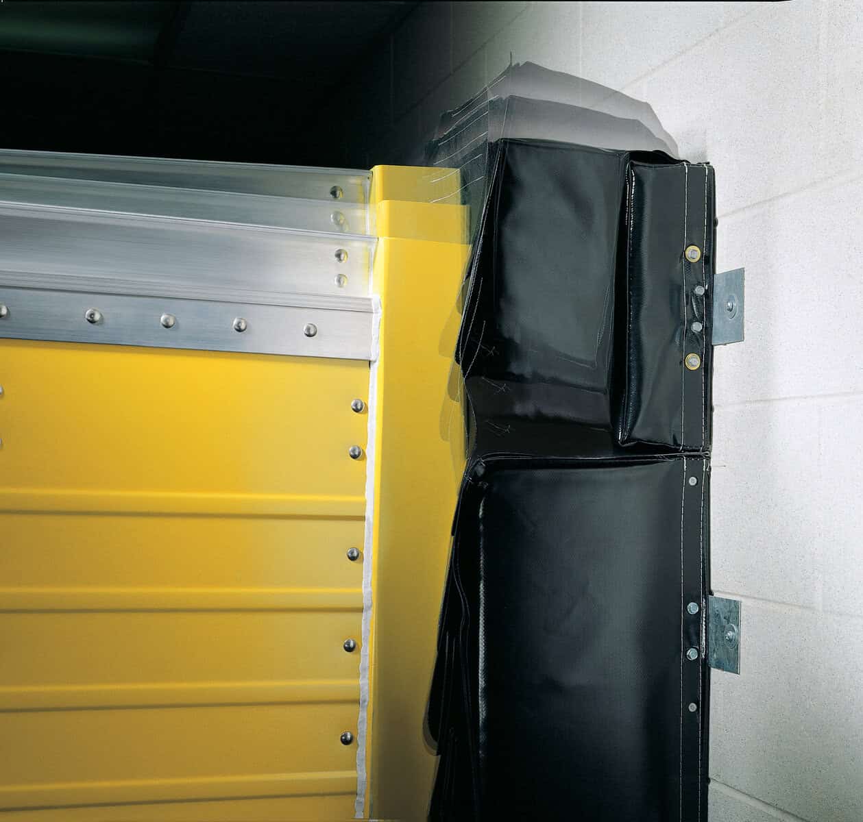 V-Seals are made of various colors and types of fabric and work with doors up to 9 feet wide and 10 feet high. The purpose of a V-Seal is to completely fill the gap between the trailer and loading dock door, ensuring that openings such as hinge gaps don’t let the elements in while also allowing workers to move unimpeded.